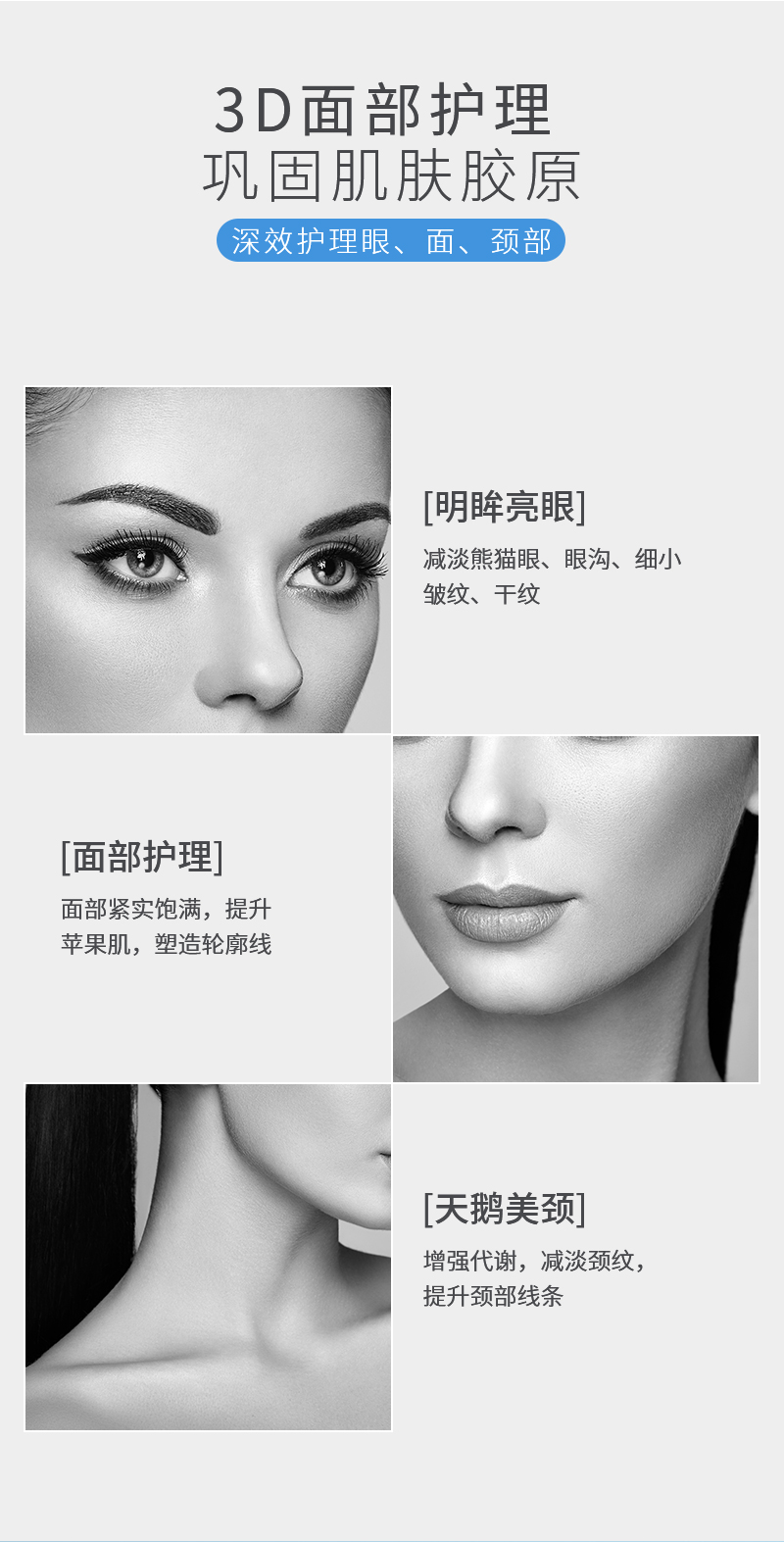 | 適用人群 | 適用于針對于面部皮膚組織松垮下垂、皺紋過多,膚質(zhì)老化粗糙,黯黃的肌膚; | ||